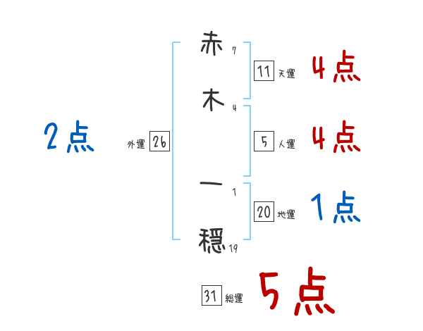 天運![]() | 赤木一穏さんの天運は11画の4つ星!着実に富や地位を得る幸運な人生。 家系が持つ宿命的な運勢を表します。祖先から受け継いだ苗字ですので自分の力が及びません。家柄を象徴します。 |