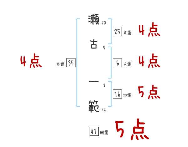外運![]() | 瀬古一範さんの外運は35画の4つ星!温厚な性格で感受性が高い。穏和な性格で人望が厚い。 生活面を象徴する運勢です。外部から受ける影響力を表し、結婚運、家庭運や職場、環境への順応性を表します。 |