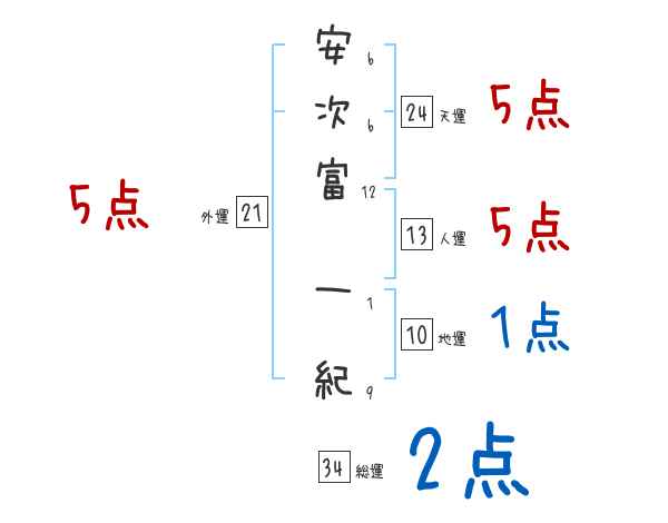 人運![]() | 安次富一紀さんの人運は13画の5つ星!才能に恵まれ人気がある。名声を手に入れる。円満な人生。 性格や才能などを表す2番目に重要な運勢です。人間関係や協調性、社会的な成功に影響します。主に20歳から50歳ぐらいまでの中年期の運勢を表します。 |