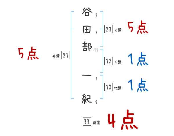 総運![]() | 谷田部一紀さんの総運は33画の4つ星!権力志向でプライドが高い。勇気があり運を切り開き成功する。 あなたの人生を表す1番重要な運勢です。生涯を通じて影響する総合運となり、主に50歳以降の晩年期に影響を及ぼします。 |