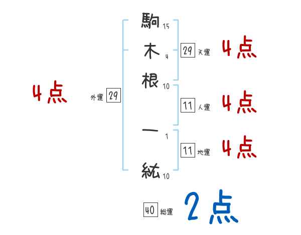 外運![]() | 駒木根一紘さんの外運は29画の4つ星!完全主義で才能がある。厳格な心の持ち主。 生活面を象徴する運勢です。外部から受ける影響力を表し、結婚運、家庭運や職場、環境への順応性を表します。 |