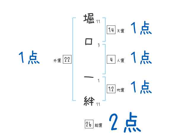 天運![]() | 堀口一絆さんの天運は14画の1つ星!人に対して優しいがストレスを溜め込みがち。人間関係のトラブルを避けるよう気をつけましょう。 家系が持つ宿命的な運勢を表します。祖先から受け継いだ苗字ですので自分の力が及びません。家柄を象徴します。 |