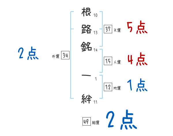 地運![]() | 根路銘一絆さんの地運は12画の1つ星!簡単な失敗で諦めてしまいやすいかも。着実に行動すると良いでしょう。 個性を表す基礎的な運勢です。性格形成や対人関係、行動力など家庭環境に影響されます。主に誕生してから20歳くらいまでの若年期の運勢を表します。 |