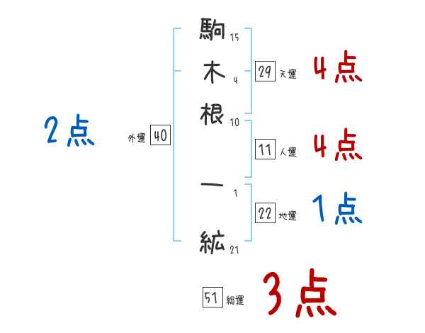 外運![]() | 駒木根一絋さんの外運は40画の2つ星!自信過剰で物事に固執するためトラブルに注意。 生活面を象徴する運勢です。外部から受ける影響力を表し、結婚運、家庭運や職場、環境への順応性を表します。 |