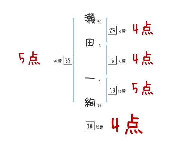 外運![]() | 瀬田一絢さんの外運は32画の5つ星!柔軟性があり成功する。チャンスが多く金運が良い。 生活面を象徴する運勢です。外部から受ける影響力を表し、結婚運、家庭運や職場、環境への順応性を表します。 |