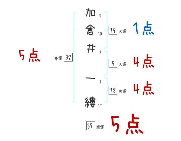 外運![]() | 加倉井一縷さんの外運は32画の5つ星!柔軟性があり成功する。チャンスが多く金運が良い。 生活面を象徴する運勢です。外部から受ける影響力を表し、結婚運、家庭運や職場、環境への順応性を表します。 |