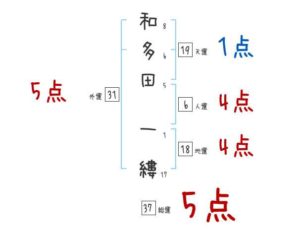 天運![]() | 和多田一縷さんの天運は19画の1つ星!優れた才能を持ちますが、協調性が足りないことも。周りの人と協力する事を意識しましょう。 家系が持つ宿命的な運勢を表します。祖先から受け継いだ苗字ですので自分の力が及びません。家柄を象徴します。 |