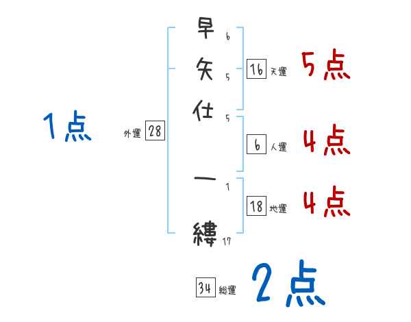 外運![]() | 早矢仕一縷さんの外運は28画の1つ星!家庭環境に注意。スポーツで活躍できる能力があるかも。 生活面を象徴する運勢です。外部から受ける影響力を表し、結婚運、家庭運や職場、環境への順応性を表します。 |