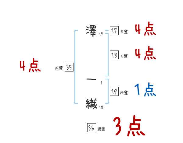 外運![]() | 澤一織さんの外運は35画の4つ星!温厚な性格で感受性が高い。穏和な性格で人望が厚い。 生活面を象徴する運勢です。外部から受ける影響力を表し、結婚運、家庭運や職場、環境への順応性を表します。 |