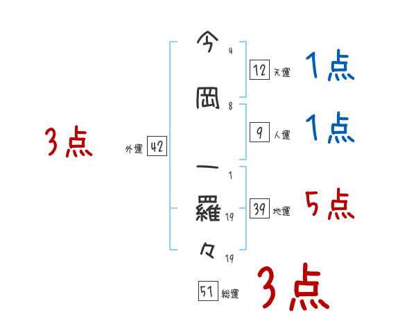 | 総運  | 今岡一羅々さんの総運は51画の3つ星!変化が激しく、危険に注意。堅実な性格。あなたの人生を表す1番重要な運勢です。生涯を通じて影響する総合運となり、主に50歳以降の晩年期に影響を及ぼします。 |
