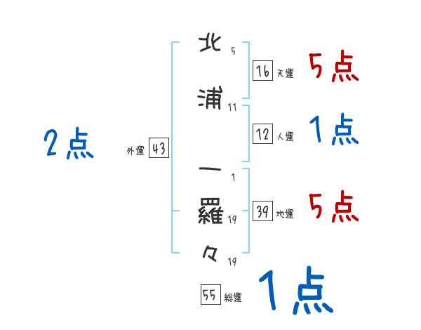 天運![]() | 北浦一羅々さんの天運は16画の5つ星!人望が厚く大きく発展する。逆転成功が見える。 家系が持つ宿命的な運勢を表します。祖先から受け継いだ苗字ですので自分の力が及びません。家柄を象徴します。 |