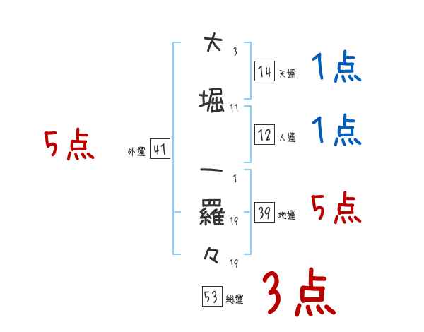 | 外運  | 大堀一羅々さんの外運は41画の5つ星!大志を抱き、目標に向かって実力を発揮し達成する。温和な性格。生活面を象徴する運勢です。外部から受ける影響力を表し、結婚運、家庭運や職場、環境への順応性を表します。 |