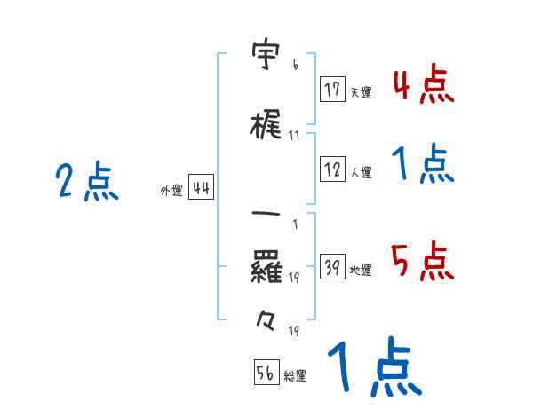 外運![]() | 宇梶一羅々さんの外運は44画の2つ星!誠実で慎重な性格。物事を考えすぎないように注意しましょう。 生活面を象徴する運勢です。外部から受ける影響力を表し、結婚運、家庭運や職場、環境への順応性を表します。 |