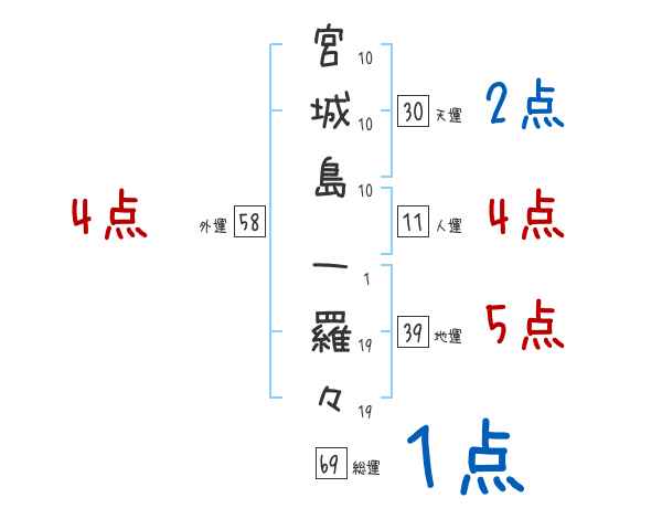 天運![]() | 宮城島一羅々さんの天運は30画の2つ星!浮き沈みの激しさに注意しましょう。 家系が持つ宿命的な運勢を表します。祖先から受け継いだ苗字ですので自分の力が及びません。家柄を象徴します。 |