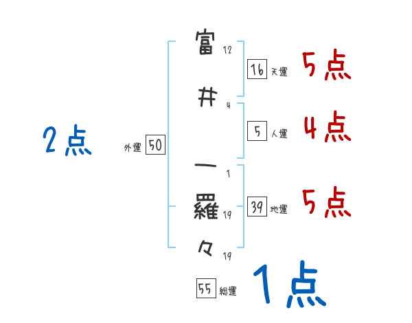 外運![]() | 富井一羅々さんの外運は50画の2つ星!浮き沈みが激しく不安定。しりすぼみに衰退しやすいので注意しましょう。 生活面を象徴する運勢です。外部から受ける影響力を表し、結婚運、家庭運や職場、環境への順応性を表します。 |