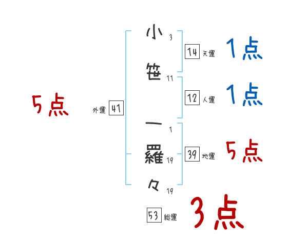 総運![]() | 小笹一羅々さんの総運は53画の3つ星!やや見栄っ張りで虚栄心がある。散財に注意。 あなたの人生を表す1番重要な運勢です。生涯を通じて影響する総合運となり、主に50歳以降の晩年期に影響を及ぼします。 |