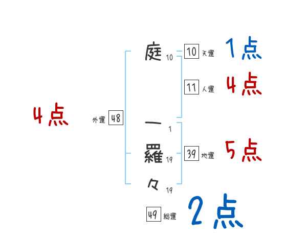 天運![]() | 庭一羅々さんの天運は10画の1つ星!不安を感じやすい傾向。ストレスを抱えないように注意しましょう。 家系が持つ宿命的な運勢を表します。祖先から受け継いだ苗字ですので自分の力が及びません。家柄を象徴します。 |