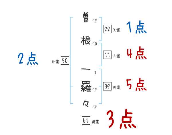 外運![]() | 曽根一羅々さんの外運は50画の2つ星!浮き沈みが激しく不安定。しりすぼみに衰退しやすいので注意しましょう。 生活面を象徴する運勢です。外部から受ける影響力を表し、結婚運、家庭運や職場、環境への順応性を表します。 |
