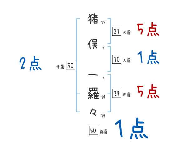 天運![]() | 猪俣一羅々さんの天運は21画の5つ星!統率力がある。独立し成功する。名誉を手に入れる。 家系が持つ宿命的な運勢を表します。祖先から受け継いだ苗字ですので自分の力が及びません。家柄を象徴します。 |