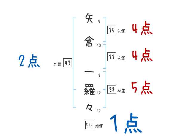 外運![]()  | 矢倉一羅々さんの外運は43画の2つ星!頑固な性格で独立心が強いかも。やや非現実的で浪費に注意しましょう。 生活面を象徴する運勢です。外部から受ける影響力を表し、結婚運、家庭運や職場、環境への順応性を表します。 |