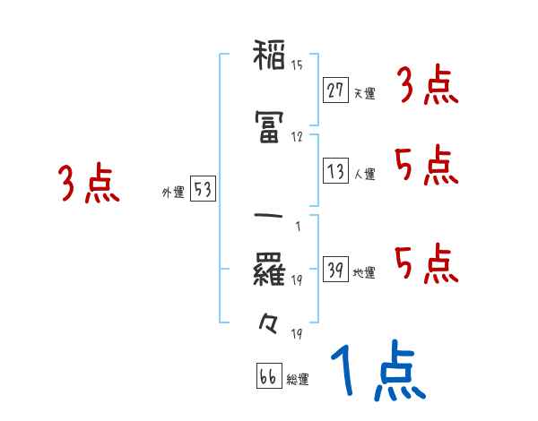 外運![]() | 稲冨一羅々さんの外運は53画の3つ星!やや見栄っ張りで虚栄心がある。散財に注意。 生活面を象徴する運勢です。外部から受ける影響力を表し、結婚運、家庭運や職場、環境への順応性を表します。 |
