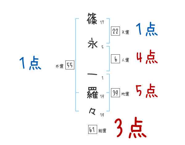 天運![]() | 篠永一羅々さんの天運は22画の1つ星!努力することが苦手ないっぽう手先が器用。芸術性にも優れる。 家系が持つ宿命的な運勢を表します。祖先から受け継いだ苗字ですので自分の力が及びません。家柄を象徴します。 |