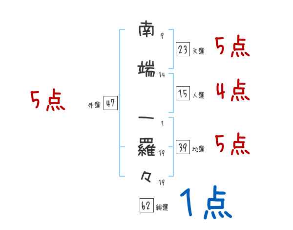 外運![]() | 南端一羅々さんの外運は47画の5つ星!実力が開花し発展する円満な人生。財に恵まれる。 生活面を象徴する運勢です。外部から受ける影響力を表し、結婚運、家庭運や職場、環境への順応性を表します。 |