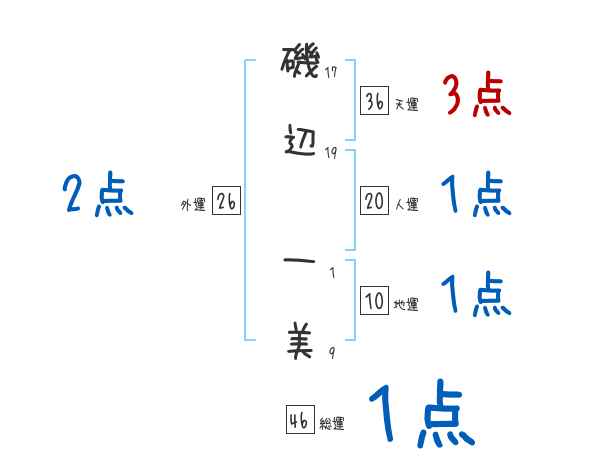 天運![]() | 磯辺一美さんの天運は36画の3つ星!先見性が豊かです。多少神経質で苦労することも。 家系が持つ宿命的な運勢を表します。祖先から受け継いだ苗字ですので自分の力が及びません。家柄を象徴します。 |