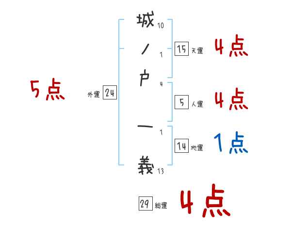 外運![]() | 城ノ戸一義さんの外運は24画の5つ星!家庭運が良く順調な人生。金運にも恵まれる。 生活面を象徴する運勢です。外部から受ける影響力を表し、結婚運、家庭運や職場、環境への順応性を表します。 |