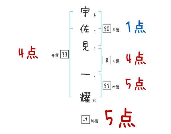 外運![]() | 宇佐見一耀さんの外運は33画の4つ星!権力志向でプライドが高い。勇気があり運を切り開き成功する。 生活面を象徴する運勢です。外部から受ける影響力を表し、結婚運、家庭運や職場、環境への順応性を表します。 |