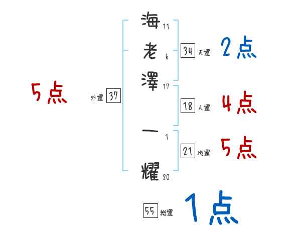 総運![]() | 海老澤一耀さんの総運は55画の1つ星!欲張りな性格で軽率な行動に注意しましょう。病気に気をつけて。 あなたの人生を表す1番重要な運勢です。生涯を通じて影響する総合運となり、主に50歳以降の晩年期に影響を及ぼします。 |