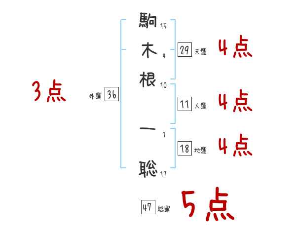 外運![]() | 駒木根一聡さんの外運は36画の3つ星!先見性が豊かです。多少神経質で苦労することも。 生活面を象徴する運勢です。外部から受ける影響力を表し、結婚運、家庭運や職場、環境への順応性を表します。 |