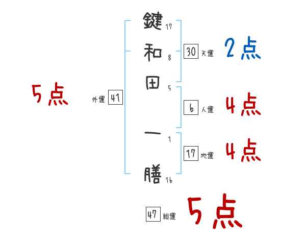 総運![]() | 鍵和田一膳さんの総運は47画の5つ星!実力が開花し発展する円満な人生。財に恵まれる。 あなたの人生を表す1番重要な運勢です。生涯を通じて影響する総合運となり、主に50歳以降の晩年期に影響を及ぼします。 |