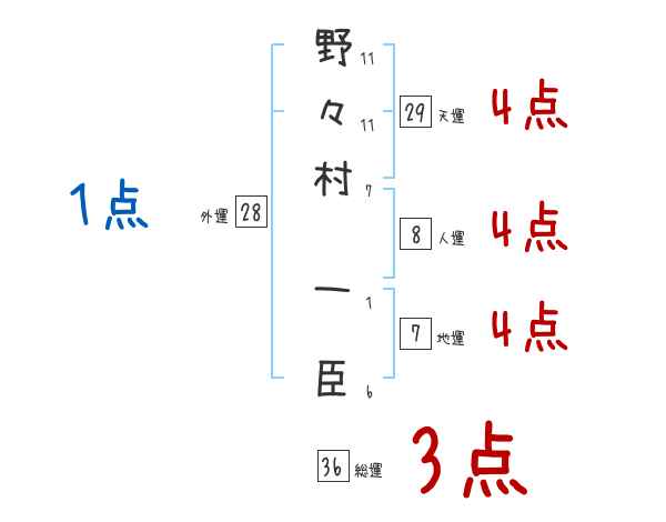 天運![]() | 野々村一臣さんの天運は29画の4つ星!完全主義で才能がある。厳格な心の持ち主。 家系が持つ宿命的な運勢を表します。祖先から受け継いだ苗字ですので自分の力が及びません。家柄を象徴します。 |