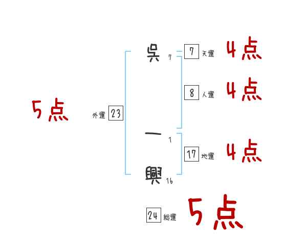 総運![]() | 呉一興さんの総運は24画の5つ星!家庭運が良く順調な人生。金運にも恵まれる。 あなたの人生を表す1番重要な運勢です。生涯を通じて影響する総合運となり、主に50歳以降の晩年期に影響を及ぼします。 |