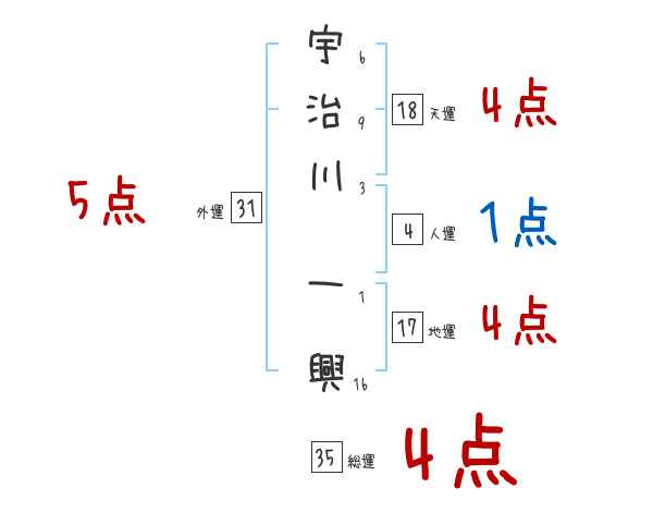 天運![]() | 宇治川一興さんの天運は18画の4つ星!情熱的で剛気。忍耐力があり信頼される。 家系が持つ宿命的な運勢を表します。祖先から受け継いだ苗字ですので自分の力が及びません。家柄を象徴します。 |