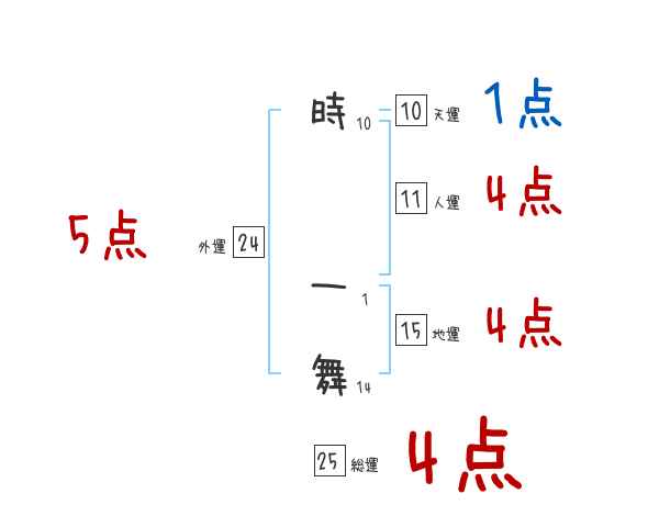 天運![]() | 時一舞さんの天運は10画の1つ星!不安を感じやすい傾向。ストレスを抱えないように注意しましょう。 家系が持つ宿命的な運勢を表します。祖先から受け継いだ苗字ですので自分の力が及びません。家柄を象徴します。 |