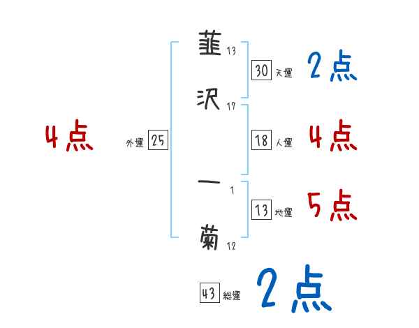 天運![]() | 韮沢一菊さんの天運は30画の2つ星!浮き沈みの激しさに注意しましょう。 家系が持つ宿命的な運勢を表します。祖先から受け継いだ苗字ですので自分の力が及びません。家柄を象徴します。 |