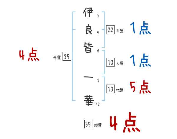 総運![]() | 伊良皆一華さんの総運は35画の4つ星!温厚な性格で感受性が高い。穏和な性格で人望が厚い。 あなたの人生を表す1番重要な運勢です。生涯を通じて影響する総合運となり、主に50歳以降の晩年期に影響を及ぼします。 |