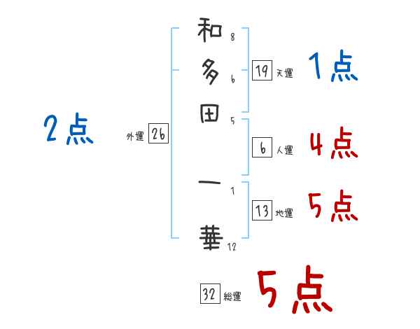 総運![]() | 和多田一華さんの総運は32画の5つ星!柔軟性があり成功する。チャンスが多く金運が良い。 あなたの人生を表す1番重要な運勢です。生涯を通じて影響する総合運となり、主に50歳以降の晩年期に影響を及ぼします。 |