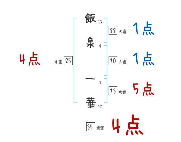 天運![]() | 飯泉一華さんの天運は22画の1つ星!努力することが苦手ないっぽう手先が器用。芸術性にも優れる。 家系が持つ宿命的な運勢を表します。祖先から受け継いだ苗字ですので自分の力が及びません。家柄を象徴します。 |