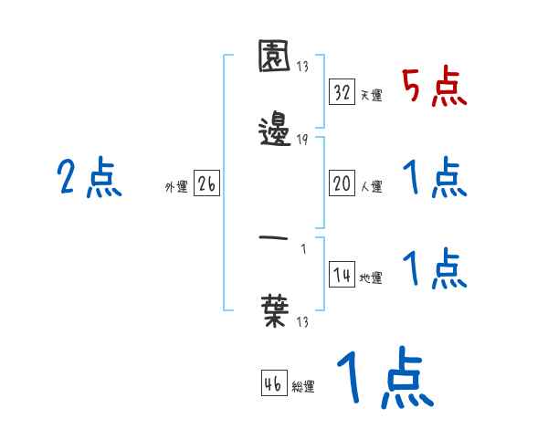 天運![]() | 園邊一葉さんの天運は32画の5つ星!柔軟性があり成功する。チャンスが多く金運が良い。 家系が持つ宿命的な運勢を表します。祖先から受け継いだ苗字ですので自分の力が及びません。家柄を象徴します。 |