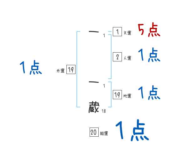 外運![]() | 一一蔵さんの外運は19画の1つ星!優れた才能を持ちますが、協調性が足りないことも。周りの人と協力する事を意識しましょう。 生活面を象徴する運勢です。外部から受ける影響力を表し、結婚運、家庭運や職場、環境への順応性を表します。 |