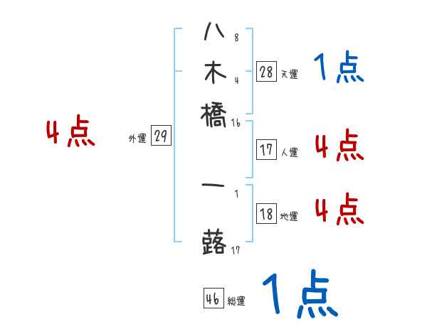 天運![]() | 八木橋一蕗さんの天運は28画の1つ星!家庭環境に注意。スポーツで活躍できる能力があるかも。 家系が持つ宿命的な運勢を表します。祖先から受け継いだ苗字ですので自分の力が及びません。家柄を象徴します。 |