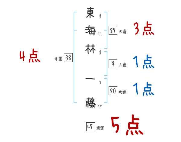 外運![]() | 東海林一藤さんの外運は38画の4つ星!温厚な性格で技術的な才能を発揮する。職人的な仕事に向いている。 生活面を象徴する運勢です。外部から受ける影響力を表し、結婚運、家庭運や職場、環境への順応性を表します。 |