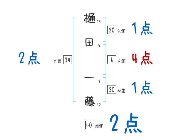 人運![]() | 樋田一藤さんの人運は6画の4つ星!慎重な努力家で信頼を得る。誠実な精神で向上心に優れる。 性格や才能などを表す2番目に重要な運勢です。人間関係や協調性、社会的な成功に影響します。主に20歳から50歳ぐらいまでの中年期の運勢を表します。 |