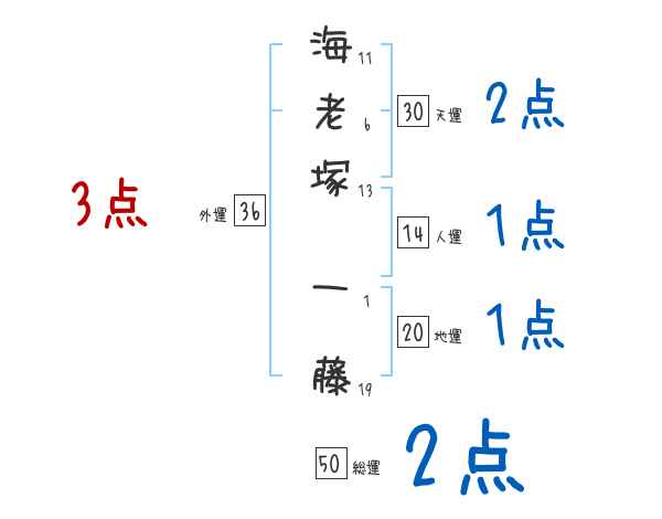 外運![]() | 海老塚一藤さんの外運は36画の3つ星!先見性が豊かです。多少神経質で苦労することも。 生活面を象徴する運勢です。外部から受ける影響力を表し、結婚運、家庭運や職場、環境への順応性を表します。 |