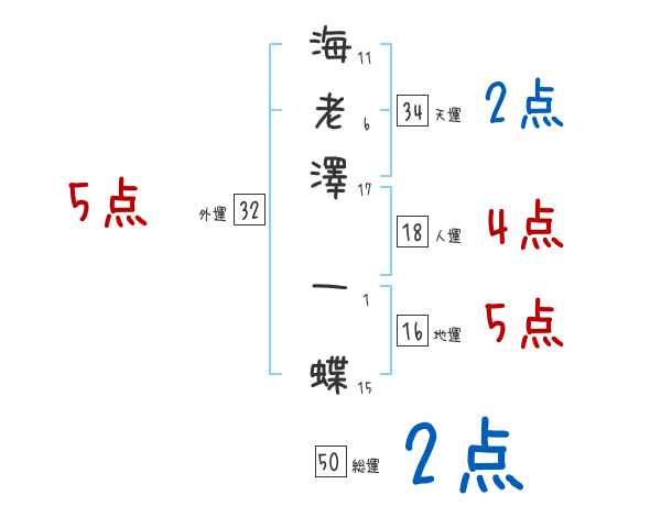 外運![]() | 海老澤一蝶さんの外運は32画の5つ星!柔軟性があり成功する。チャンスが多く金運が良い。 生活面を象徴する運勢です。外部から受ける影響力を表し、結婚運、家庭運や職場、環境への順応性を表します。 |