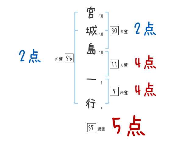 天運![]() | 宮城島一行さんの天運は30画の2つ星!浮き沈みの激しさに注意しましょう。 家系が持つ宿命的な運勢を表します。祖先から受け継いだ苗字ですので自分の力が及びません。家柄を象徴します。 |