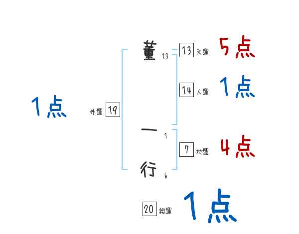 天運![]() | 董一行さんの天運は13画の5つ星!才能に恵まれ人気がある。名声を手に入れる。円満な人生。 家系が持つ宿命的な運勢を表します。祖先から受け継いだ苗字ですので自分の力が及びません。家柄を象徴します。 |